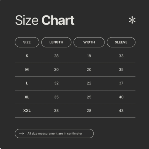 Available in a range of sizes, you can easily find your perfect fit by consulting our sizing chart. For a relaxed look, consider sizing up, ensuring you feel comfortable and stylish every time you wear it.